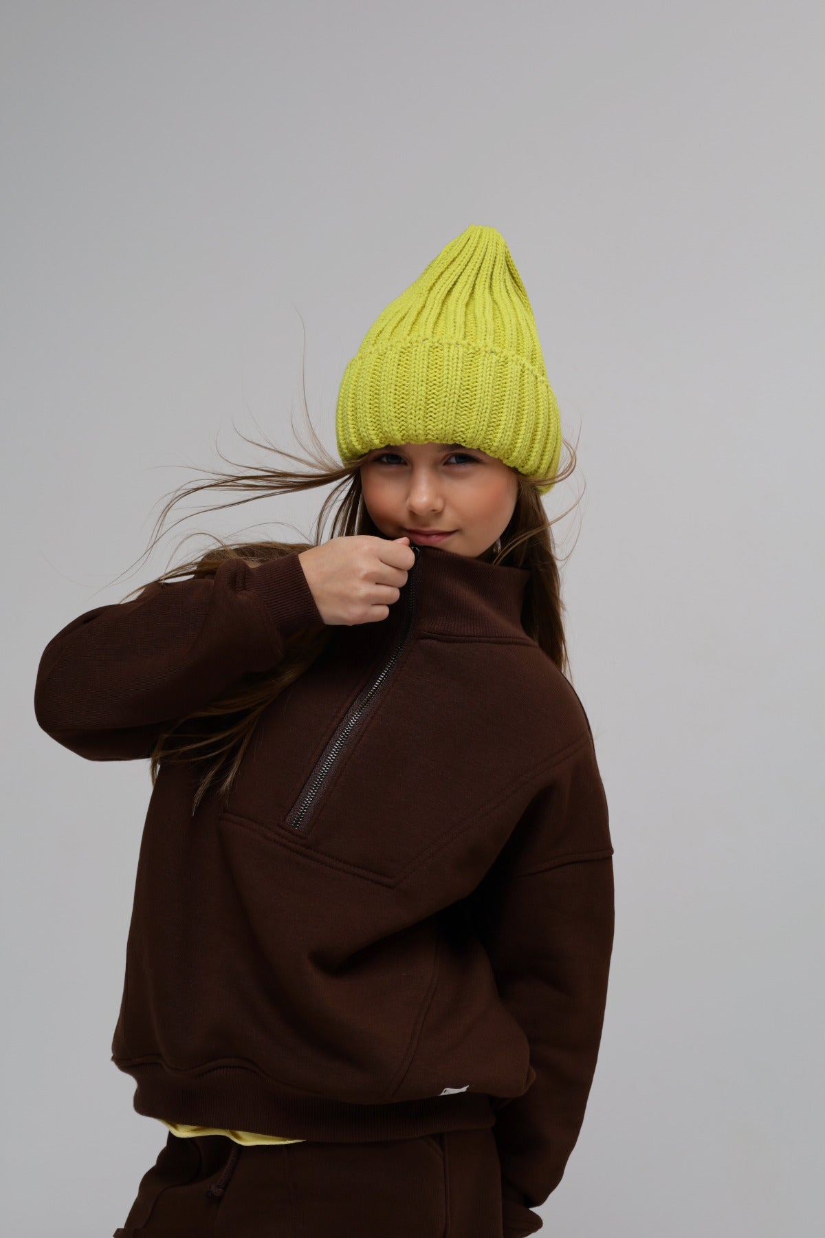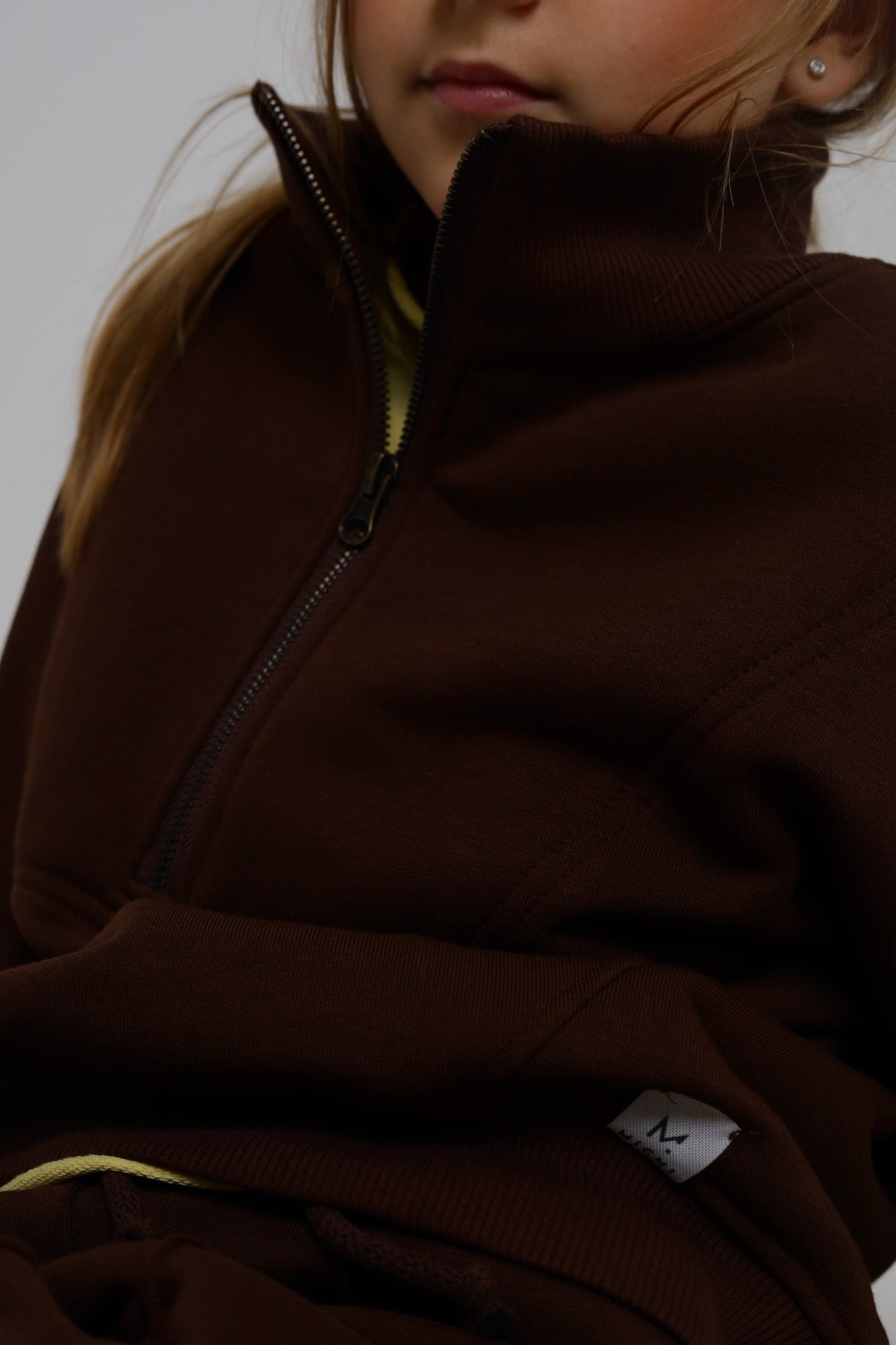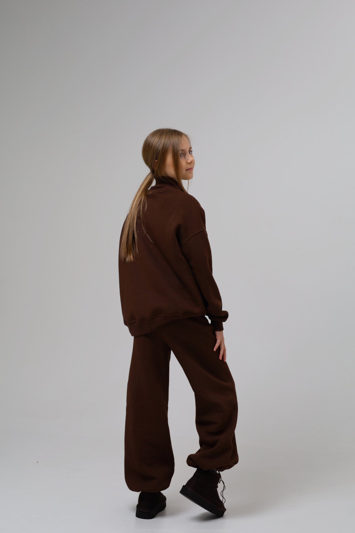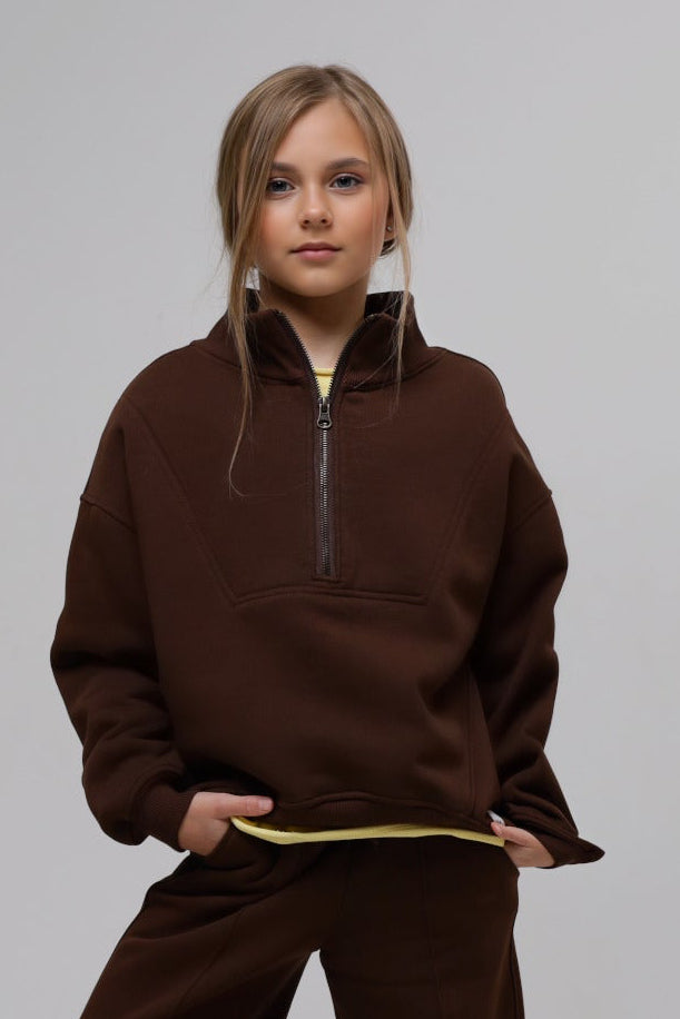 Modna bluza w stylu „mini–me” — fason inspirowany dorosłą modą, zaprojektowany z myślą o komforcie dziecka. Wykonana z wysokiej jakości dzianiny, ocieplana od środka miękkim misia, oversize – wygląda jak bluza dorosła, ale daje pełną swobodę ruchów .Wysoka stójka na zamek, obniżona linia ramion, rękawy i dół wykończone elastycznym ściągaczem, miękka, przytulna i idealna na chłodniejsze dni .