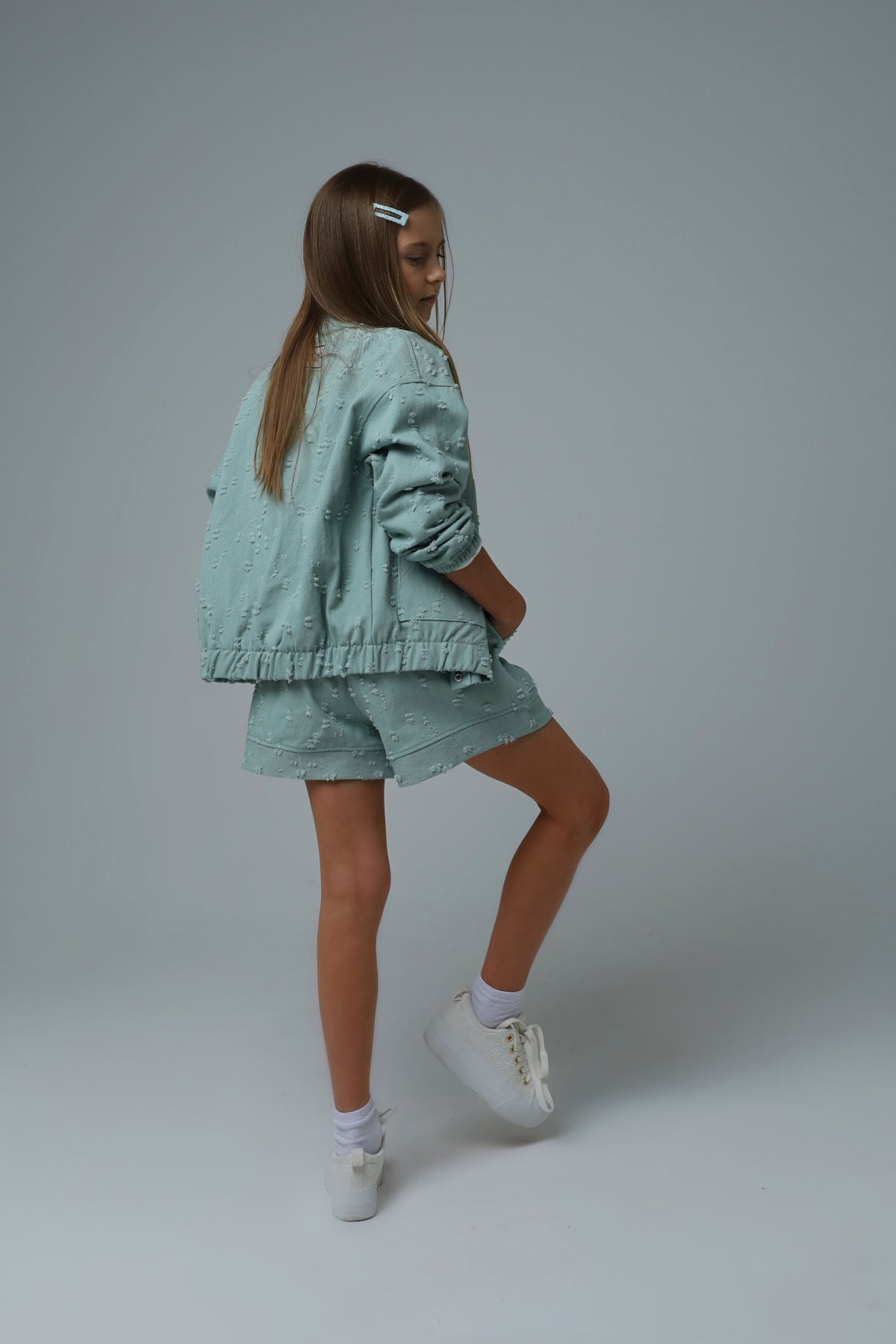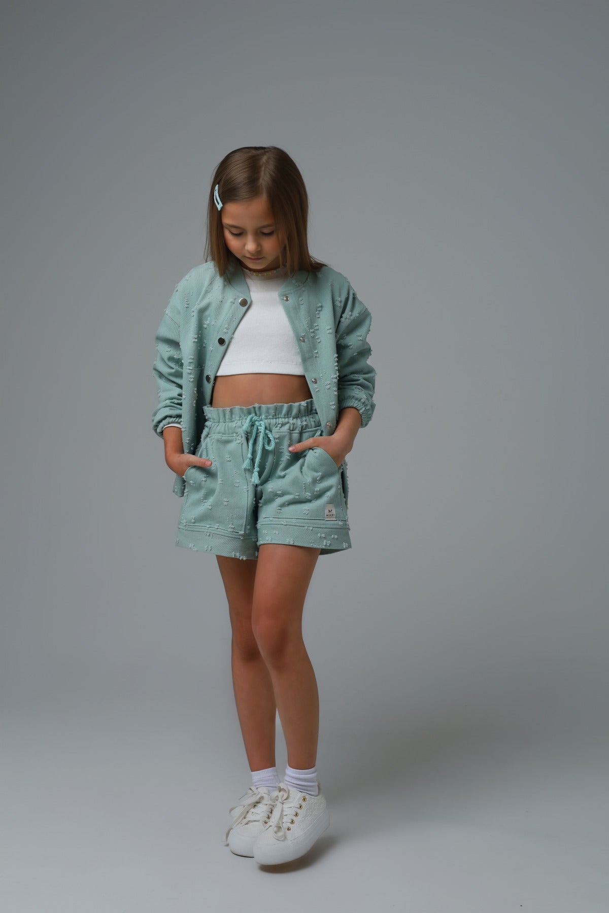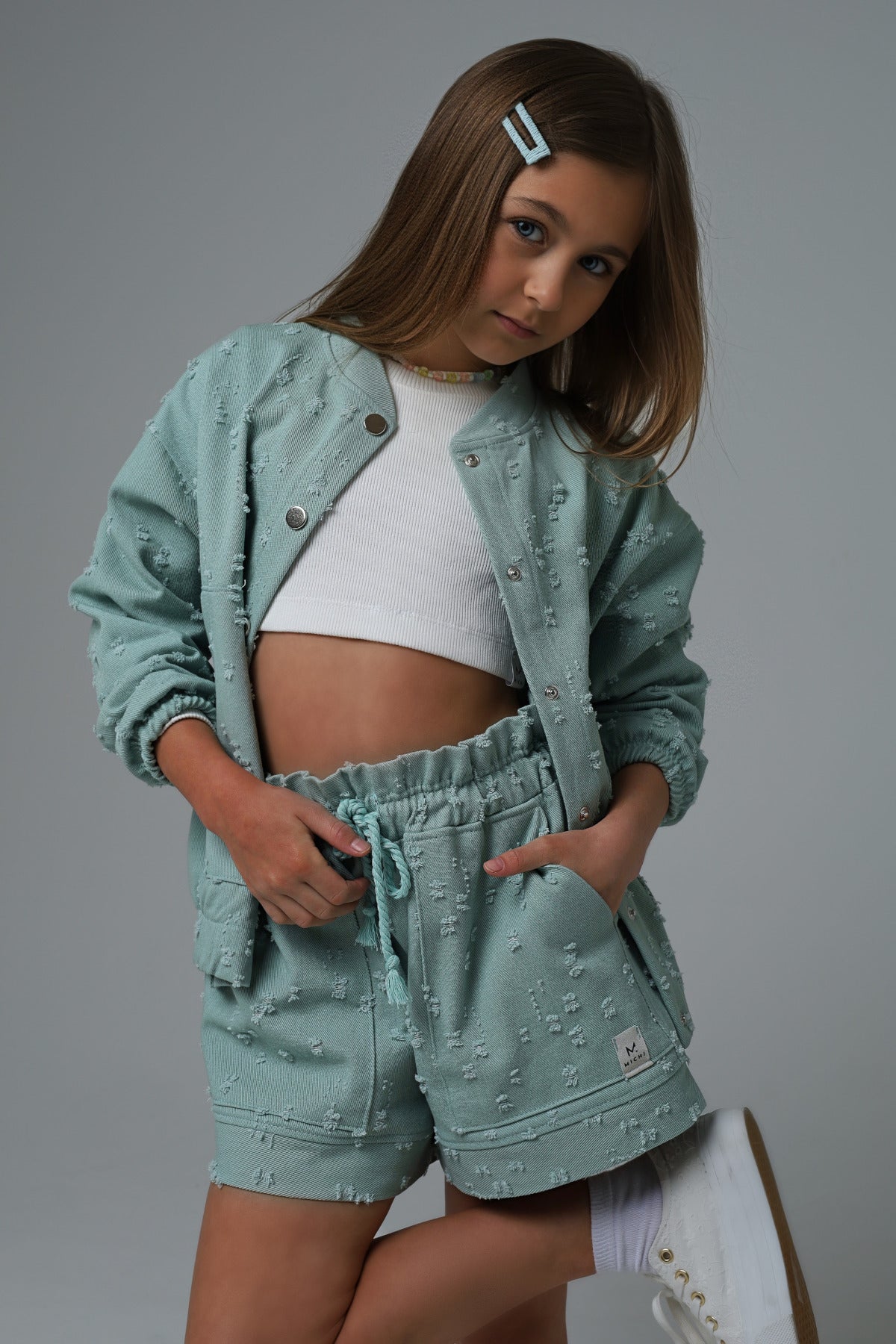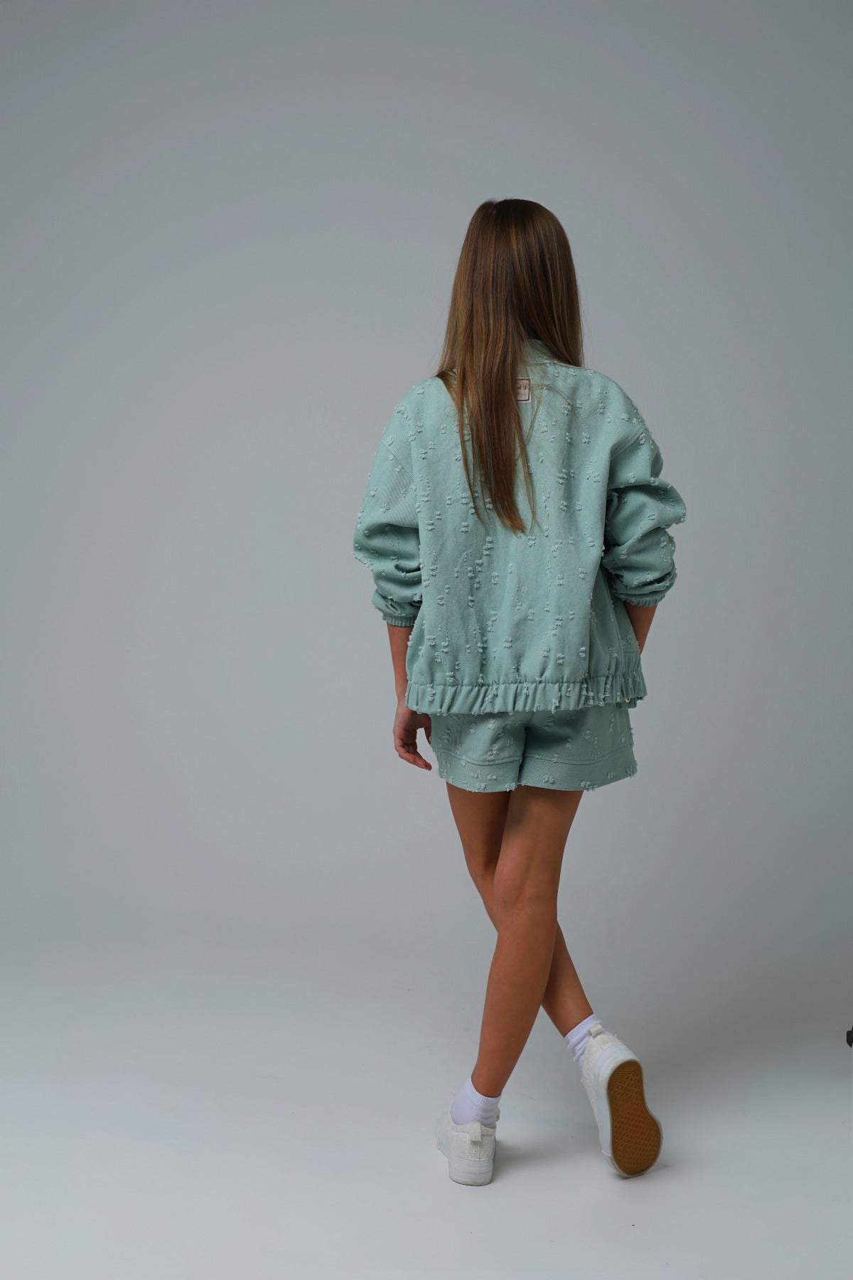 Lekka, stylowa i supermodna! Nasza bomberka z miętowego dżinsu to idealne uzupełnienie wiosennych stylizacji. Ma wygodny, luźny krój, elastyczne ściągacze przy rękawach i dole oraz delikatnie sprany efekt materiału z teksturą. Zapinana na napy, z praktycznymi kieszeniami i wykończona w najmniejszych detalach. Noś ją jako część kompletu albo solo – zawsze robi wrażenie!
