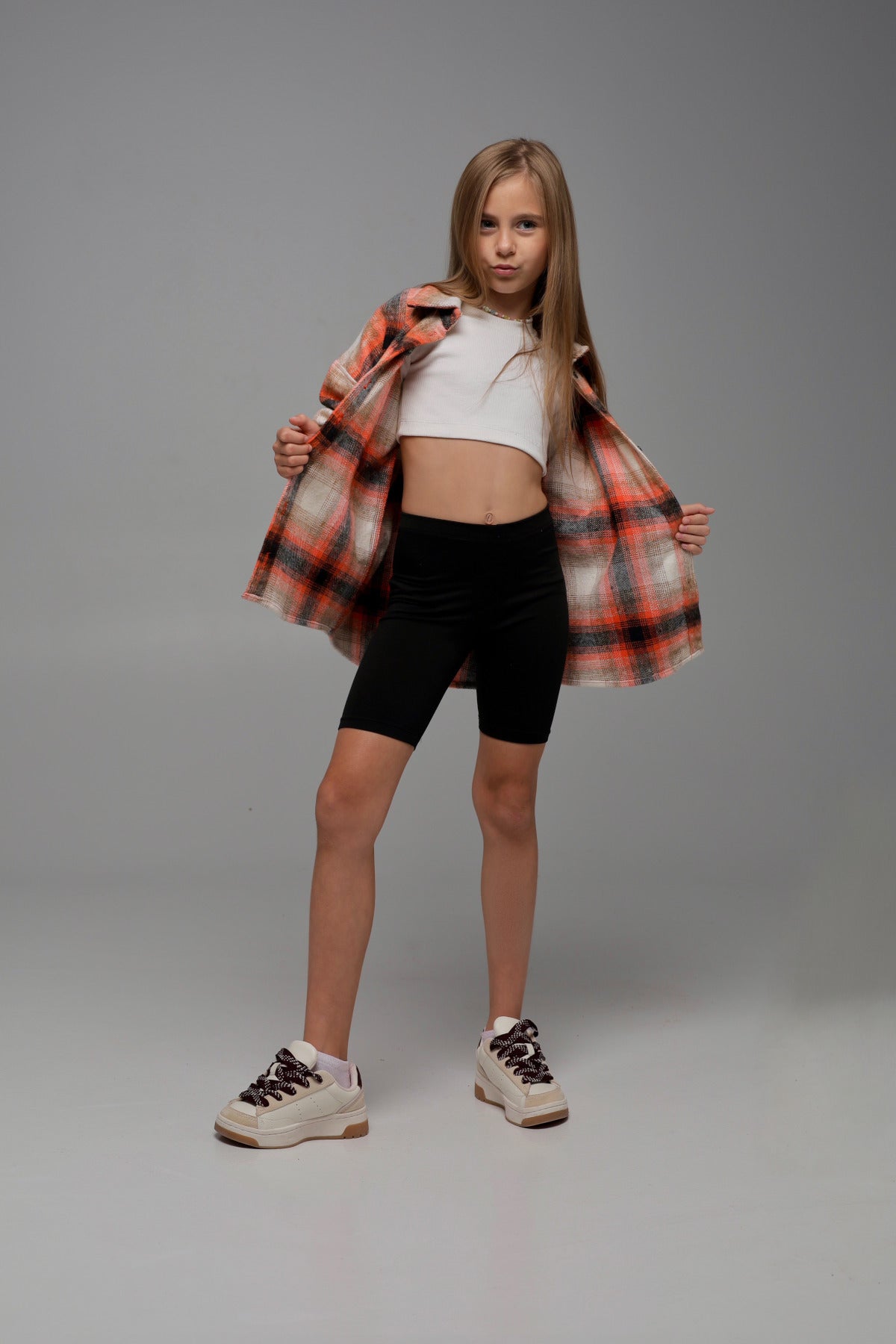 Modelka 128 cm wzrostu ma na sobie rozmiar 122-128 cm.