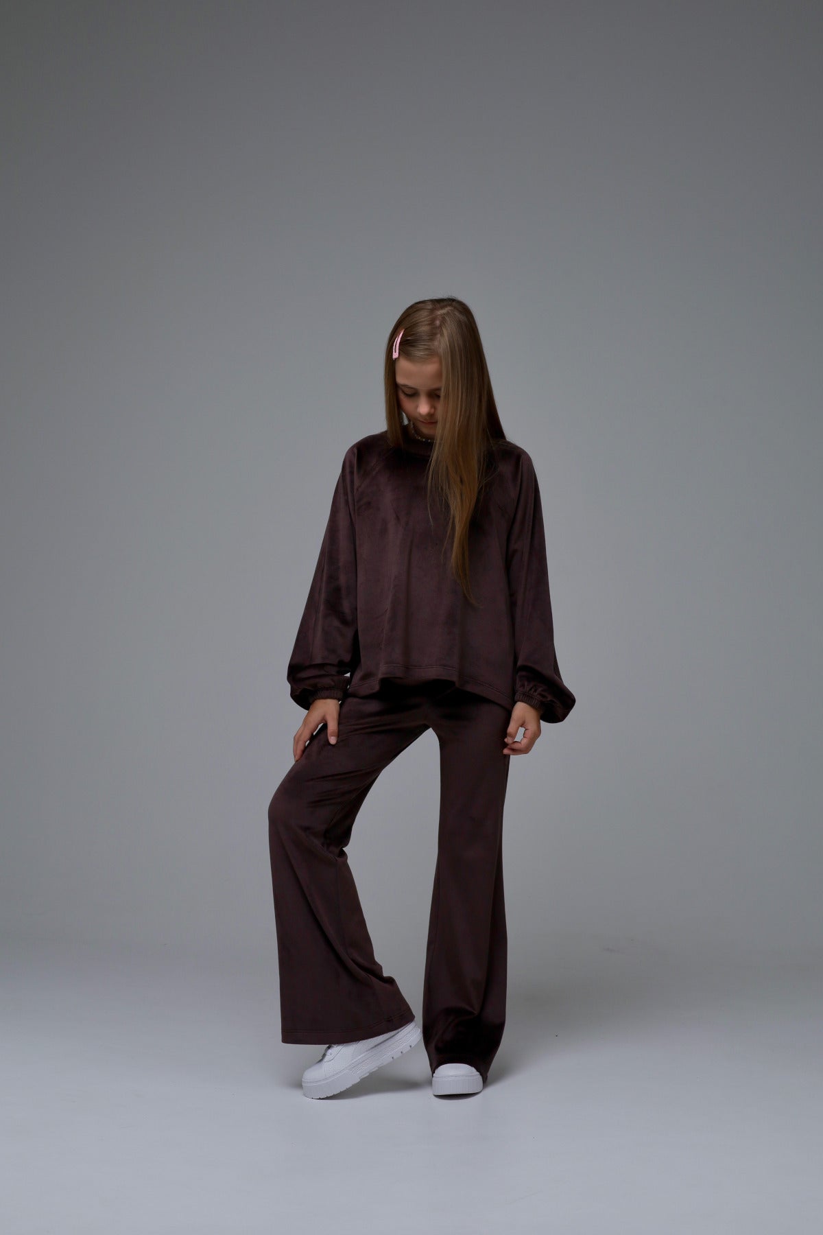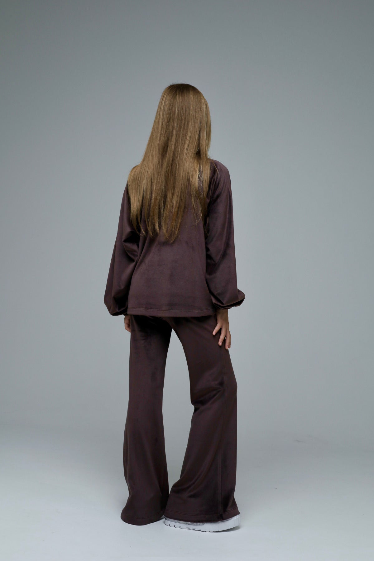 Legginsy „Cocoa Crush” .Uszyte z aksamitnego, luksusowego weluru w głębokim, czekoladowym odcieniu Cocoa Crush — materiału, który miękko otula skórę i subtelnie połyskuje w świetle. Dopasowany krój pięknie podkreśla sylwetkę, a delikatne rozszerzenie od kolana nadaje nogawkom lekkości i modowego charakteru. W pasie miękka, elastyczna gumka zapewnia wygodę i idealne dopasowanie. Model nie krępuje ruchów i jest stworzony z myślą o maksymalnym komforcie przez cały dzień.