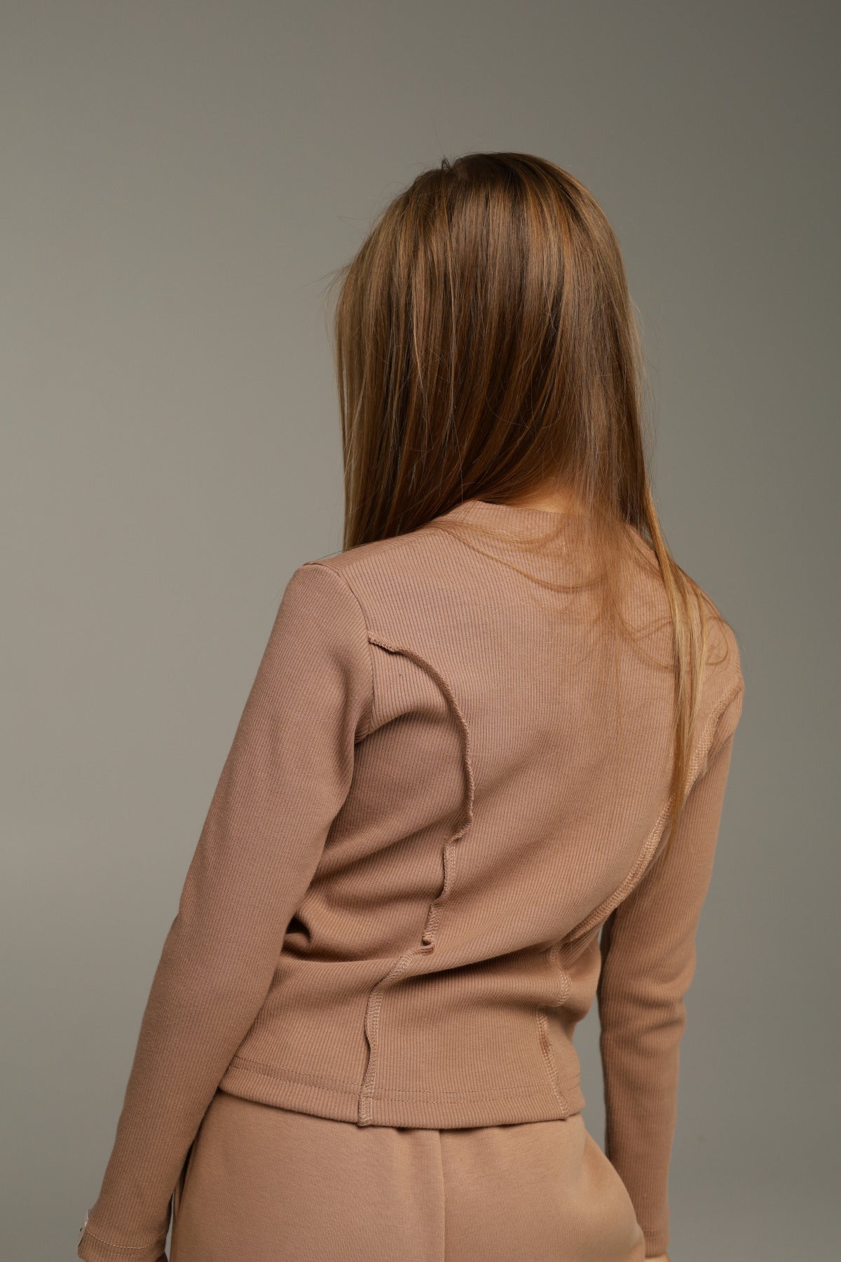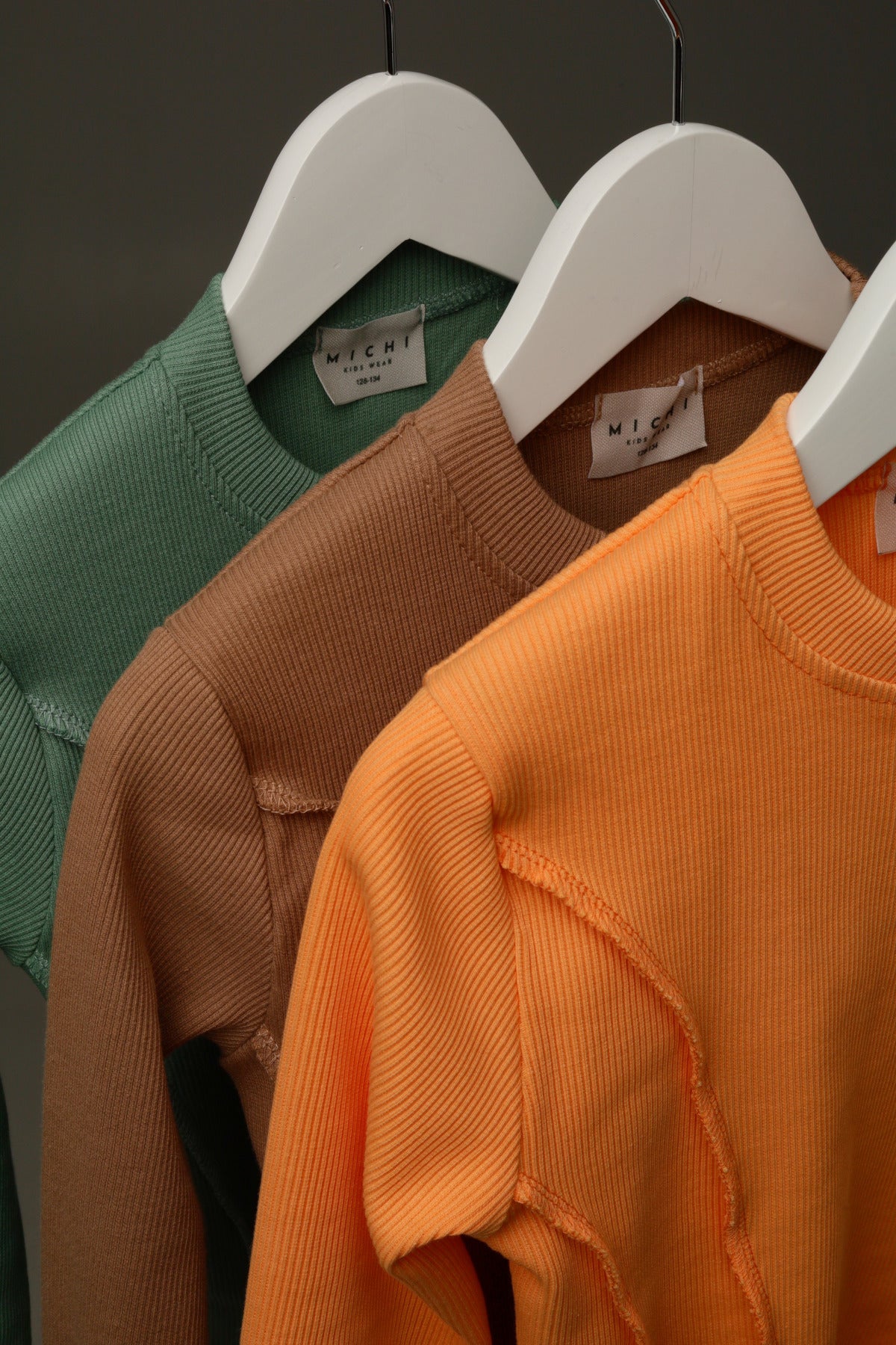 Longsleeve z dzianiny prążkowanej (Lauren Green / Cappuccino / Jasna Pomarańcza).Otula, dopasowuje się i zawsze wygląda stylowo. Uszyty z miękkiej, prążkowanej dzianiny, która subtelnie układa się na sylwetce i nie ogranicza ruchów. Delikatne, surowe przeszycia nadają mu wyjątkowego charakteru, a naturalna bawełna z domieszką elastanu zapewnia komfort przez cały dzień. Minimalistyczny fason sprawia, że longsleeve pasuje do wszystkiego — od codziennych stylizacji po te bardziej wyjątkowe.