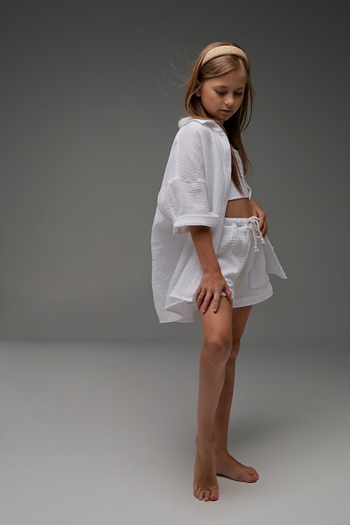 Szorty muślinowe MICHI (biały). Komfort i styl w jednym. Delikatne jak chmurka – szorty z muślinu MICHI w kolorze białym otulają skórę miękkością i swobodą. Elastyczna guma, dekoracyjny sznurek, praktyczne kieszenie i subtelnie wywinięte nogawki – wszystko zaprojektowane z myślą o ruchliwych dniach i letnich emocjach. W komplecie z koszulą wyglądają po prostu bosko.