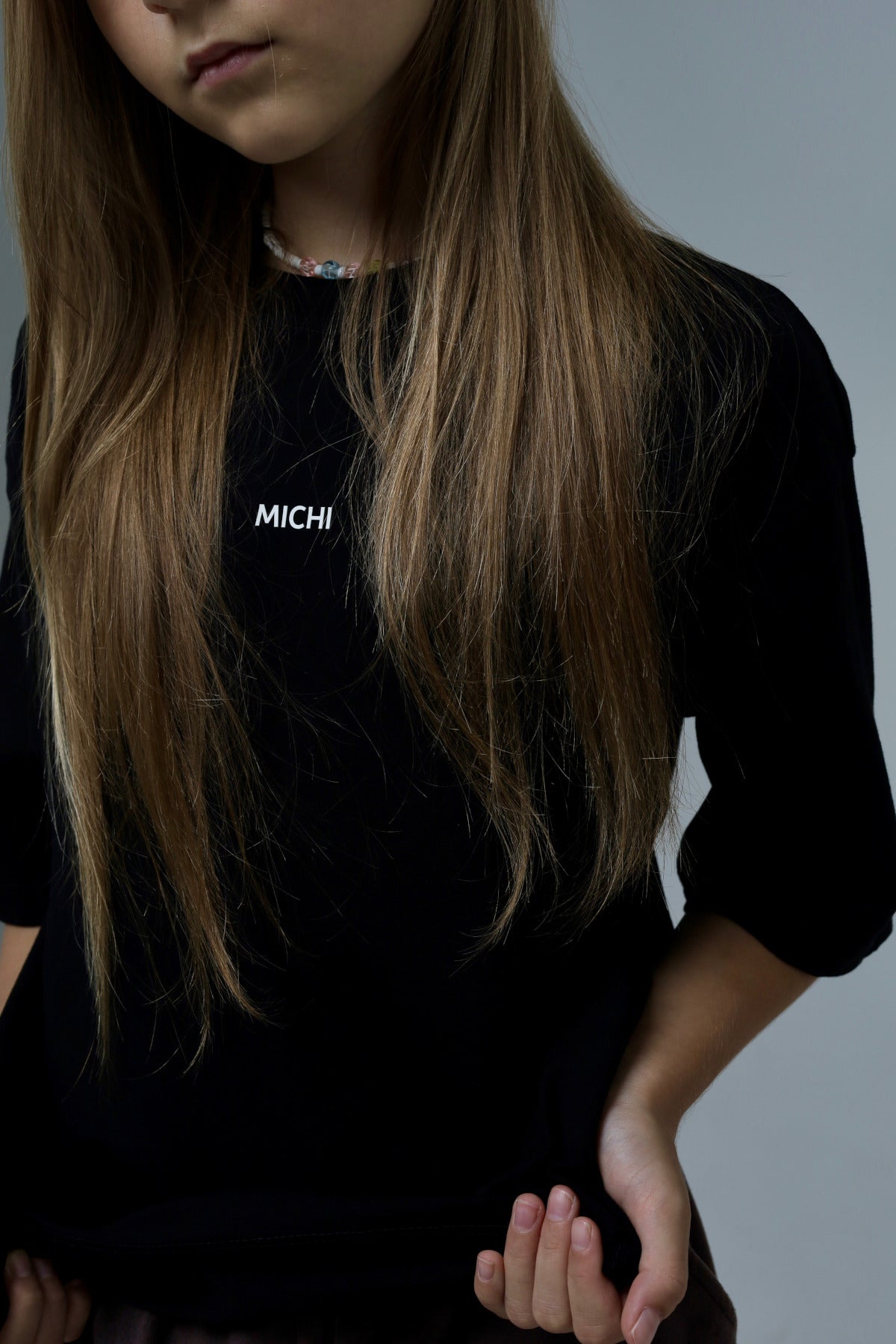 Modelka wzrostu 130 cm, ma na sobie rozmiar 128-134 cm.